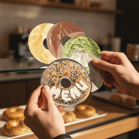 The final concept introduces a playful and confident brand identity paired with an interactive laminated menu system that allows customers to physically build their bagel by layering ingredients.